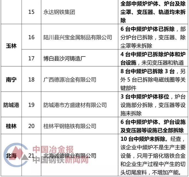 報告稱,自治區(qū)發(fā)展改革委、工業(yè)和信息化委、質(zhì)監(jiān)局于2017年3月27日-4月9日分別帶隊赴賀州、梧州、玉林市開展打擊“地條鋼”現(xiàn)場督查工作。除北海誠德鎳業(yè)有限公司外,已對涉嫌違法生產(chǎn)“地條鋼”企業(yè)實施停電措施,未發(fā)現(xiàn)中頻爐違規(guī)生產(chǎn)“地條鋼”現(xiàn)象。該報告還稱,督查發(fā)現(xiàn),大部分企業(yè)的處置措施僅是停電停產(chǎn)、拆除爐體、封存設(shè)備,均未能按照四個要求徹底拆除,“以停代關(guān)”情況比較普遍,容易異地轉(zhuǎn)移生產(chǎn)和“死灰復(fù)燃”。