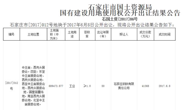 6月9日,石家莊市國(guó)土資源局發(fā)布了一則國(guó)有建設(shè)用地使用權(quán)公開(kāi)出讓結(jié)果公告,公告中成交的地塊編號(hào)為[2017]012號(hào)地,該地塊位于“中王舍、西崗頭居委會(huì)。四至:東至中王舍居委會(huì)地、西崗頭居委會(huì)地,西至中王舍居委會(huì)地、西崗頭居委會(huì)地、國(guó)營(yíng)苗圃場(chǎng)地,南至西崗頭居委會(huì)地,北至中王舍居委會(huì)地”,占地面積689473.877平方米(約合1034.21畝),土地用途為工業(yè)用地,容積率 1,出讓年限50年,成交價(jià)款41368萬(wàn)元(4.1368億元)。