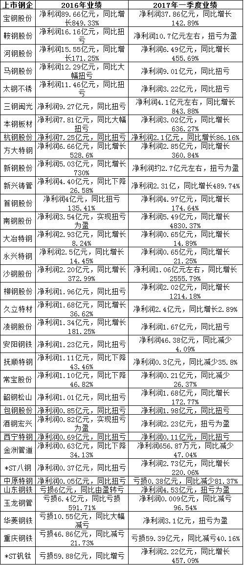截至5月10日,34家上市鋼企皆已發(fā)布2016年年報。其中,15家大幅扭虧,10家盈利增長超8%以上;4家盈利有所下降,另5家虧損。2016年寶鋼股份凈利潤為89.66億元位居第一,鞍鋼以16.16億元排名第二,河鋼股份15.55億元排名第三。